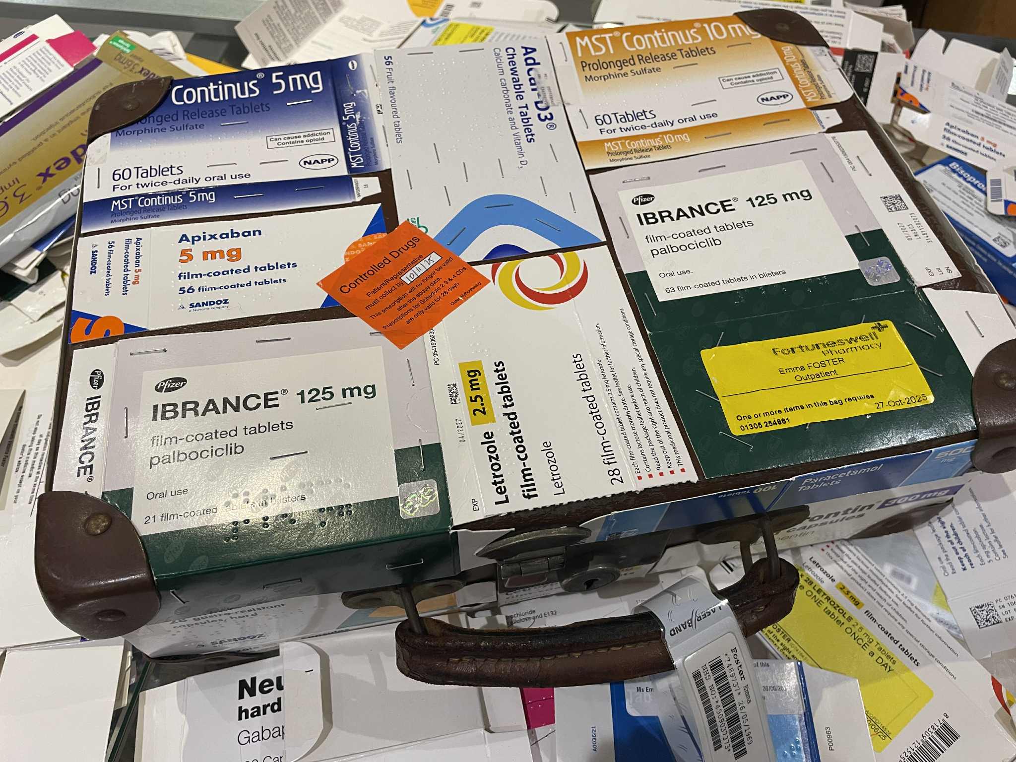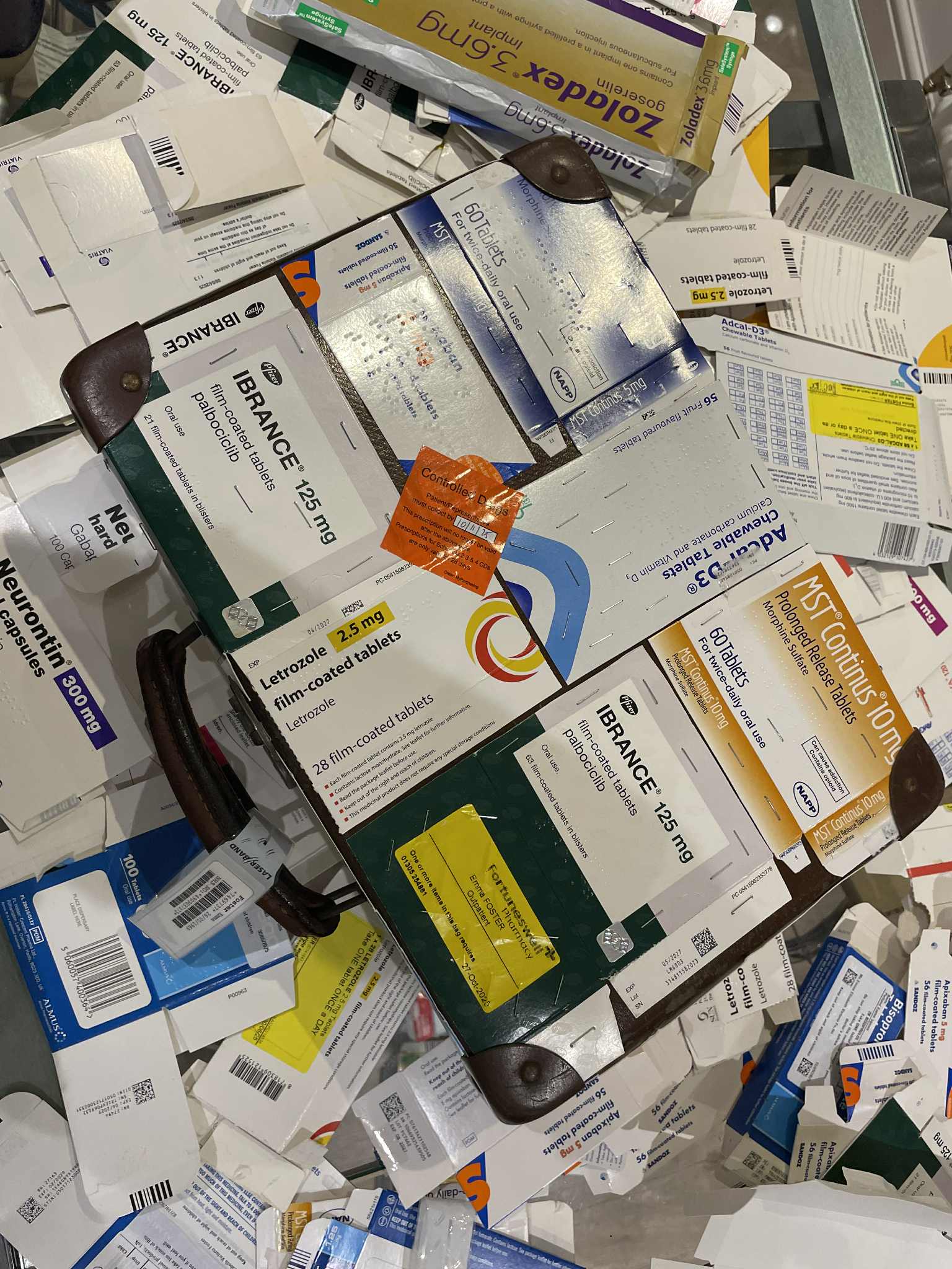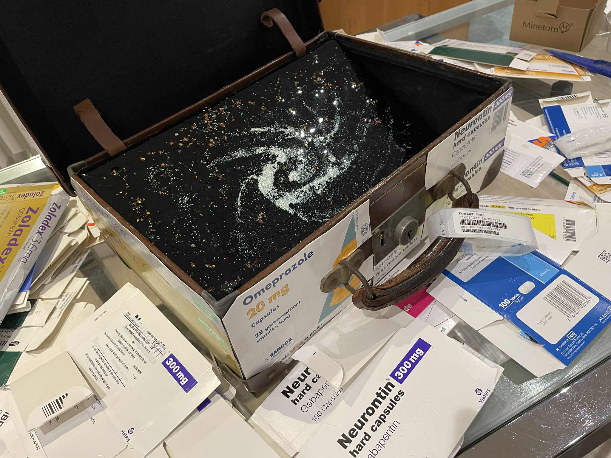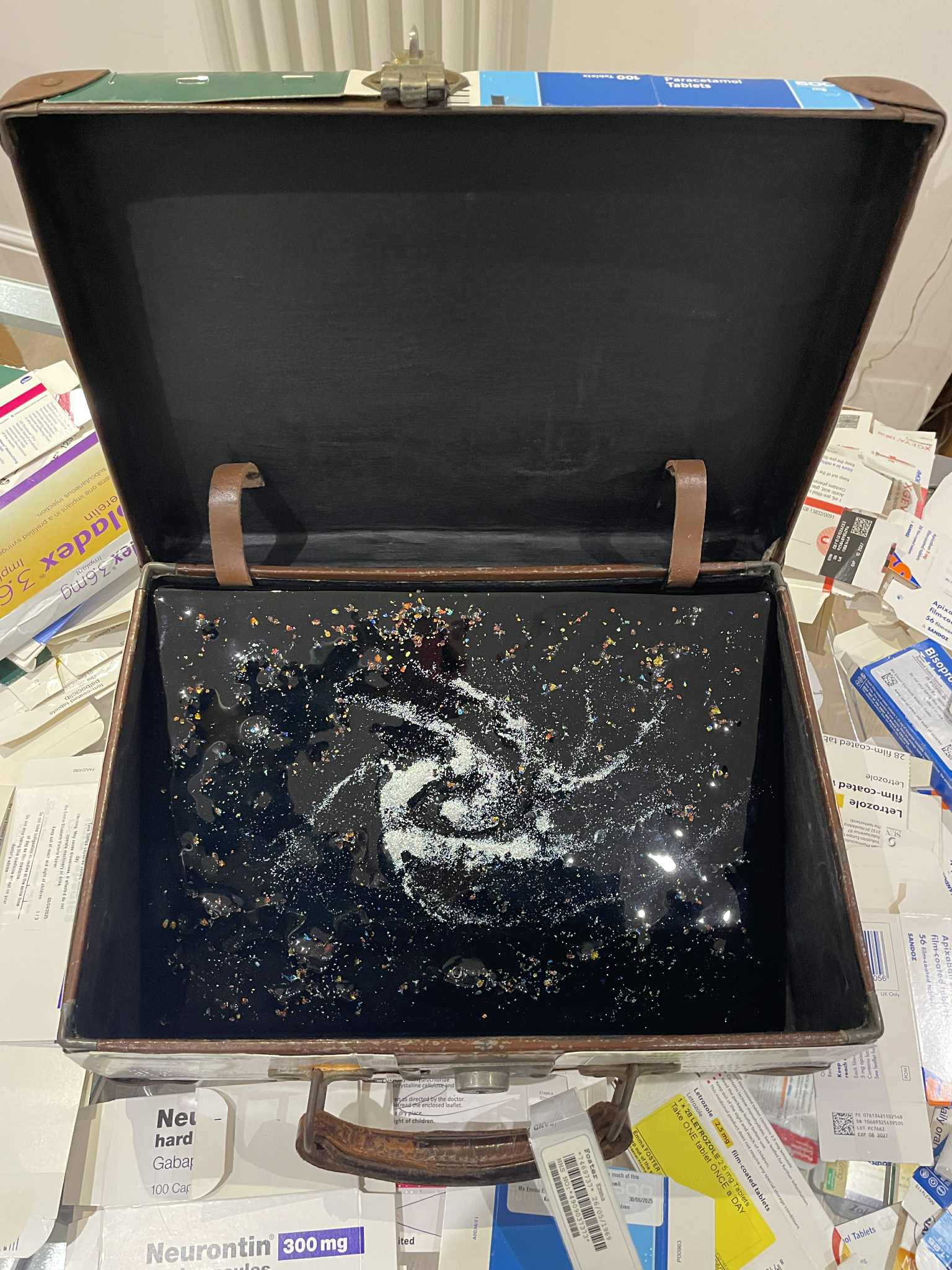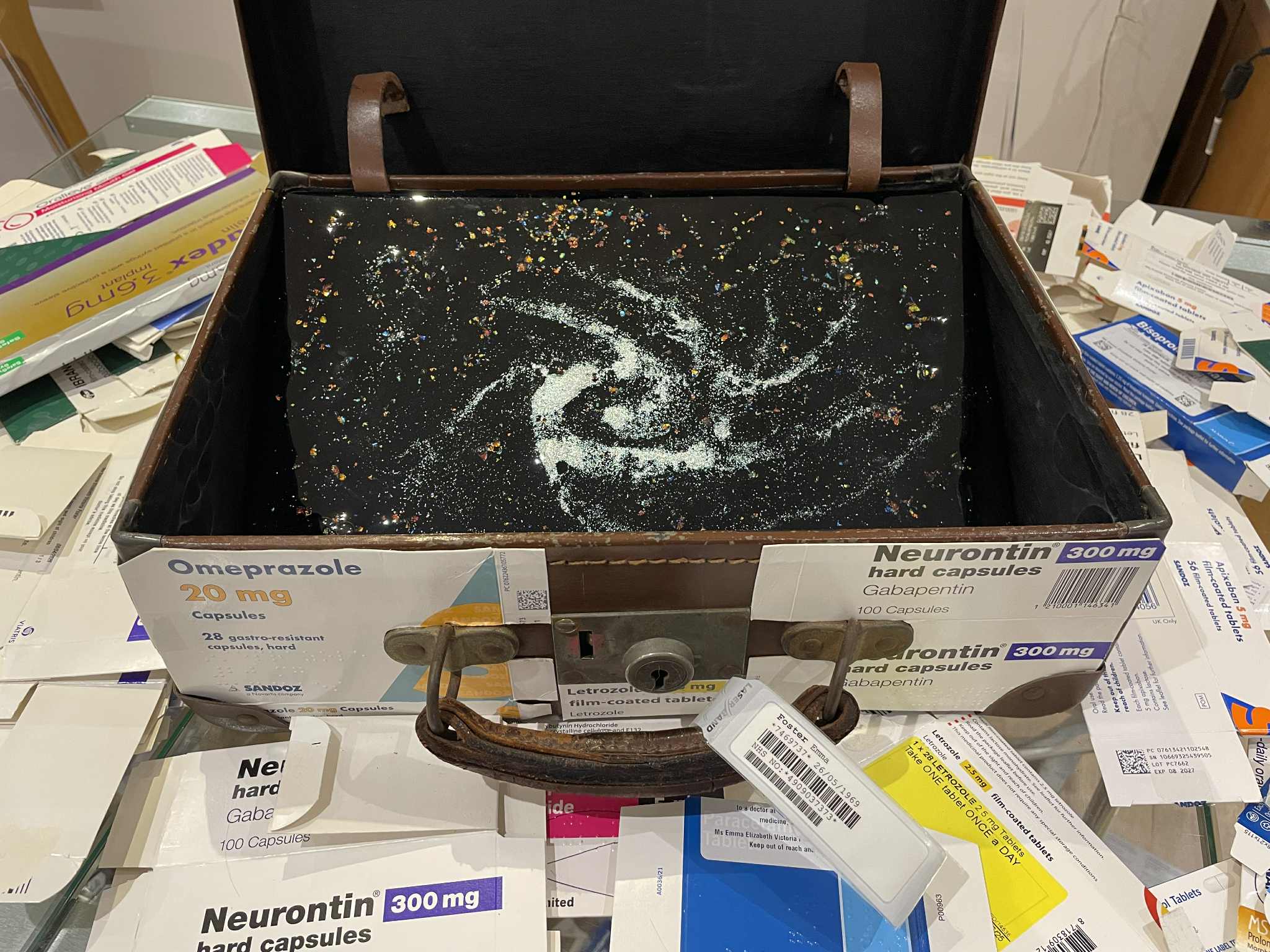 My piece is a suitcase covered with all the empty boxes of medication I'm taking. I have metastatic breast cancer, and these medications are keeping the cancer from coming back for as long as I can tolerate them. I'm also taking medications to counter the damaging effects on my body of these drugs. The medication boxes are stapled down to reflect the staples in my leg when my cancer diseased femur was removed and replaced with a full femoral metal prosthetic, including my knee, all the way down to my tibia. I am slightly bionic!