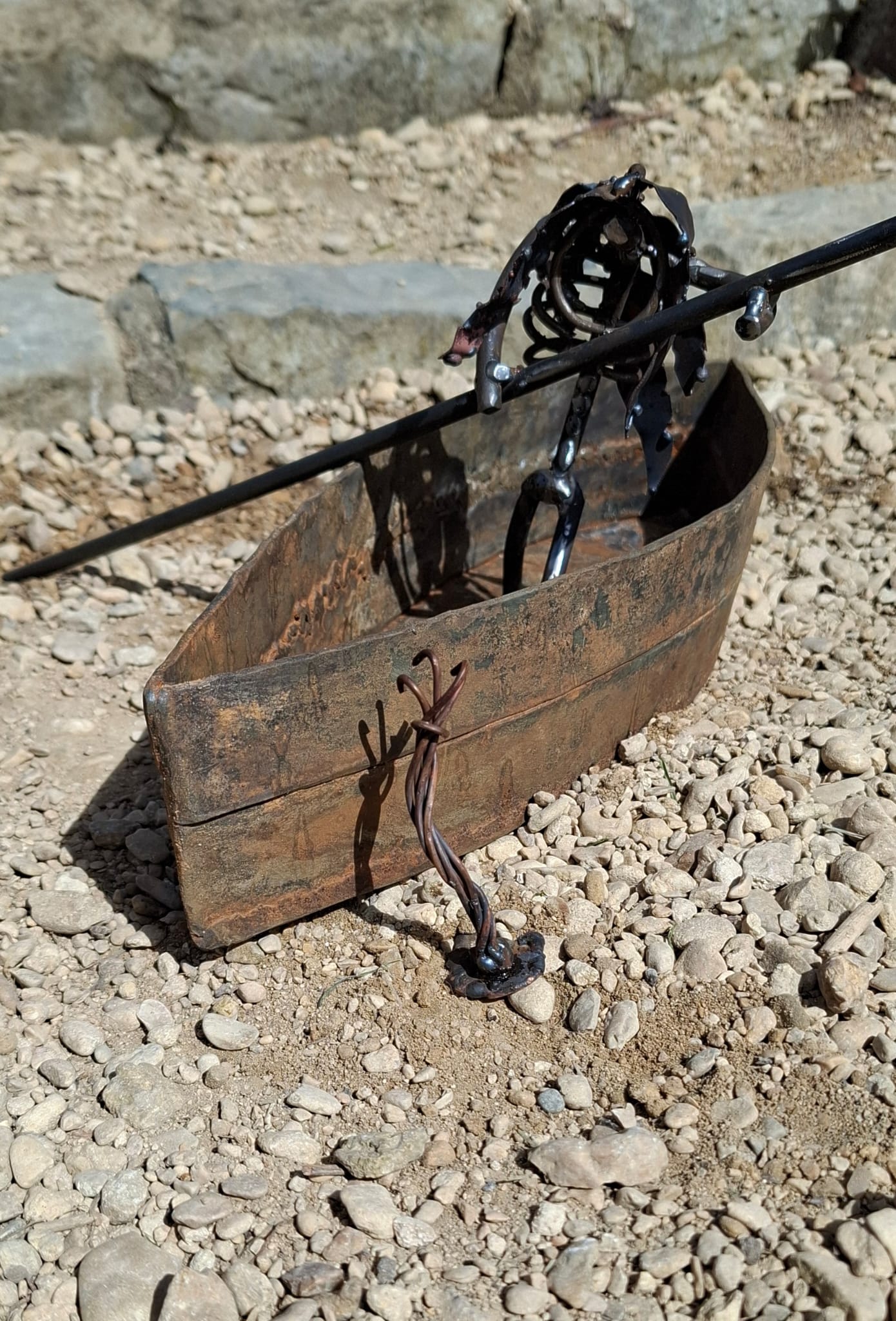 The concept of being judged at death by one’s deeds whilst alive is a common theme throughout all religions. Charon, more commonly known as ‘the Ferryman’, was believed by the Ancient Greeks to carry the souls of the dead across the river Styx to the underworld. Once across, Hades would judge whether the souls were to pass into one of the 3 realms: Tartarus, a deep pit for punishment, the Asphodel Meadows, a neutral place for the ordinary people, and Elysium, the fields of paradise for the heroic and the virtuous. This sculpture is crafted from steel and treated with various salt solutions to accelerate the corrosion process, reflecting the decay of the human body. The hand represents those souls who are unable to pay the ferryman and are forced to haunt the living. It is made from copper wire, and its base is an old copper penny signifying the ‘Obol’, which was placed in the mouth of the deceased.